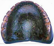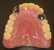 金属床義歯 保険適用の入れ歯と違い、骨組に金属を使用していますので、変形がなく壊れにくく丈夫です。 |